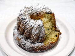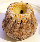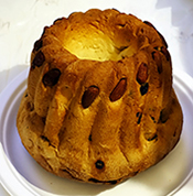 アルザス地方の伝統郷土菓子。陶器のクグロフ型にアーモンドとキルシュで香りをつけたレーズンを入れ、ブリオッシュ風の生地を入れて焼き上げたもの。(食べる前に粉砂糖をふりかけるといわれていますが、売っている段階で、かかっているものとかかっていないものがあります。)