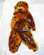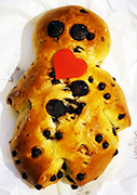 男の子を形取った菓子パン。『マナラ』・『ボノム』と名付けられる、12月6日「聖ニコラウスの日」と呼ばれる日に、このパンを食べる習慣があるそうです。一般的に、プレーンと、チョコチップの入ったショコラがあります。サイズやデザインは、お店によってオリジナル。