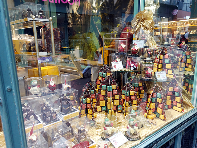 アンティークな雰囲気のショーウィンドウは、この時期、クリスマスの雰囲気いっぱいに!ツリーの立体型の『Calendrier de l'Avent(アドベントカレンダー)』や、クリスマスモチーフの立体チョコなどが、山積みに!
