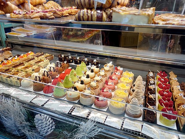通りがかる人をくぎ付けに・・・。繊細で色とりどり、季節感いっぱいのフランス菓子のPâtisseries。この時期、クリスマスモチーフのものも、とても可愛く、揃っています・・・。
