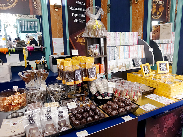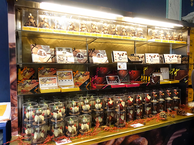 壁面にも目一杯に広がる商品棚には、この時期、クリスマスモチーフの立体チョコや、ギフトタイプの商品ばかりが、いっぱいに陳列。フランスでは、お祭りやイベントにチョコレートを贈る習慣が強く、また非常に喜ばれます。『Noël』も最も代表的なうちのひとつ。
