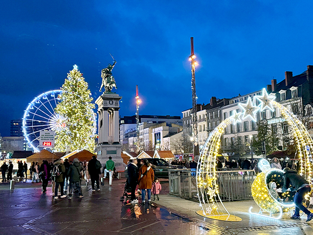 クリスマスシーズンが近づくと、街の通りはイルミネーションやクリスマスの飾りで彩り、まるでおとぎ話の世界のように変わっていきます・・・。そして、その中心となるのが、この「Place de Jaude(ジョード広場)」で開催される「Marché de Noël(クリスマスマーケット)」。2025年は、11月28日(金)から12月28日(日)まで、広場は、約1000個のイルミネーションで彩られ、メリーゴーランドや観覧車が設置され、フランスや、このオーヴェルニュ、地元の特産物や郷土料理などを販売するchalet(屋台)が、軒を並べます。街全体がひとつになって取り組み、楽しみの場となっています。クリスマスに向けて・・・、クリスマスシーズンを楽しむ人々で賑わい、どんどんと活気づいていきます。