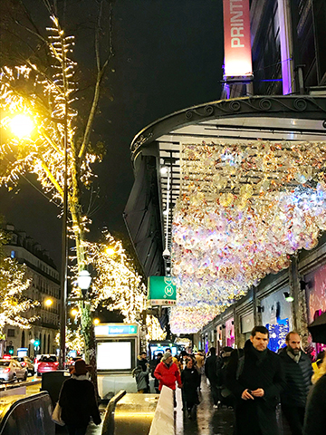 パリの有名なデパートが集まる“オスマン通り”。この時季、この通りは、クリスマスや年末年始の買い物をする、地元の人々で、ごった返し、朝から晩まで、かなりの賑わいになります。そして、この通りや、デパートの競い合うようなイルミネーションを、楽しみにしている人も多いです。