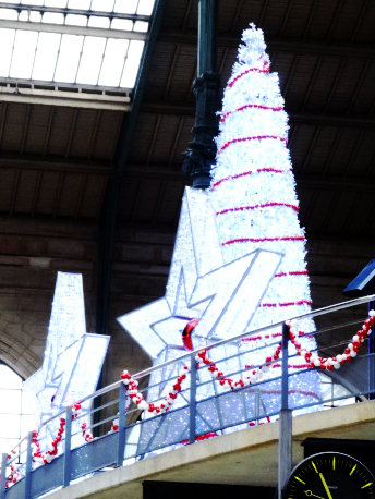 ●『パリ・北駅』のクリスマスツリー パリ市内の北東部にあり、ロンドンに向かう“ユーロスター”や、オランダ、ベルギーと結ぶ“タリス”などの国際線の発着駅。近郊のヨーロッパ諸国との窓口の主要な大きな駅です。電飾のみで出来たパールホワイトのツリーに、赤いポイント。パリは、白いツリーもよく見かけます。駅構内には、同じツリーが数カ所にあり、パリらしいクリスマスの風情です。