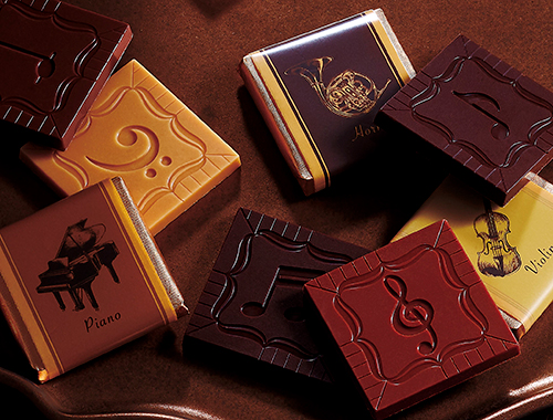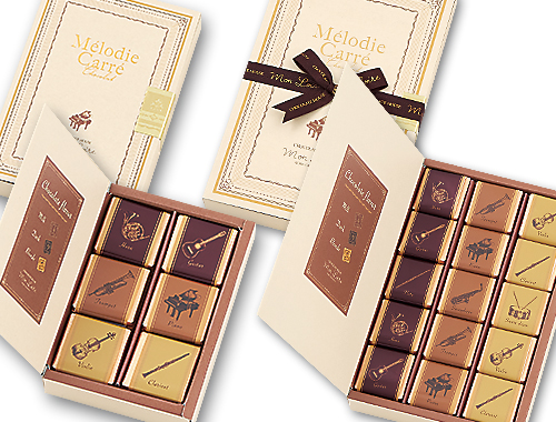 ◆長年、たくさんのお客様にご好評をいただいておりました『Melody』が、『Mélodie・Carré・Chocolat』として生まれ変わり、新登場です!“音楽”をテーマに・・・、楽器と音符が奏でるショコラ。ダーク、ミルク、ブロンドの3色の板チョコレートを、ブックタイプのオシャレなボックスに並べました。贈り物にも是非、オススメです。