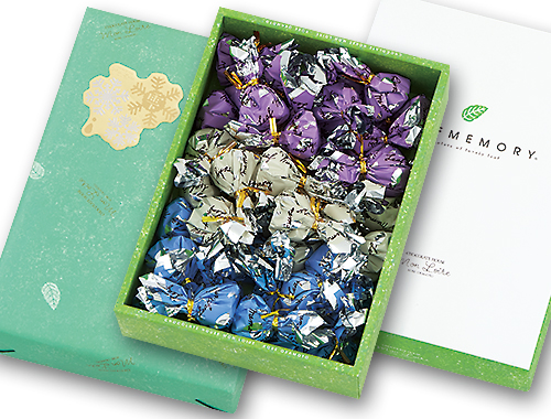 Web限定新商品の、『LeafmemoryギフトBOX』。“雫”をイメージしてお詰めしたギフトボックスには、紫・白・青の3色の巾着の組み合わせ。Webだけの、冬の限定アイテムです。